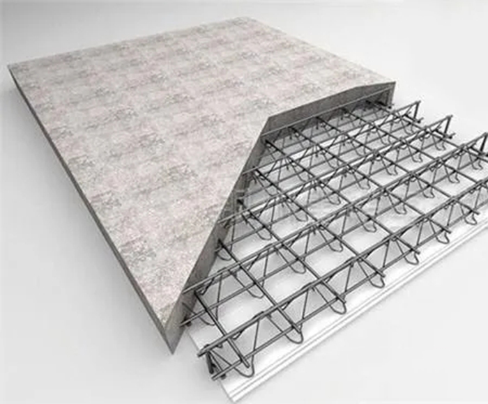 鋼筋桁架樓承板是將樓板中的鋼筋在工廠采用進(jìn)口設(shè)備加工成為鋼筋桁架,并將鋼筋桁架與鍍鋅板在工廠焊成一體的組合樓承板。在施工階段,鋼筋桁架樓承板可承受施工荷載,直接鋪設(shè)到梁上,并進(jìn)行簡(jiǎn)單的鋼筋鋼結(jié)構(gòu)工程,便可澆筑混凝土。由于完全取代了模板功能,減少了模板架設(shè)和拆卸工程,大大提高了樓板施工效率。