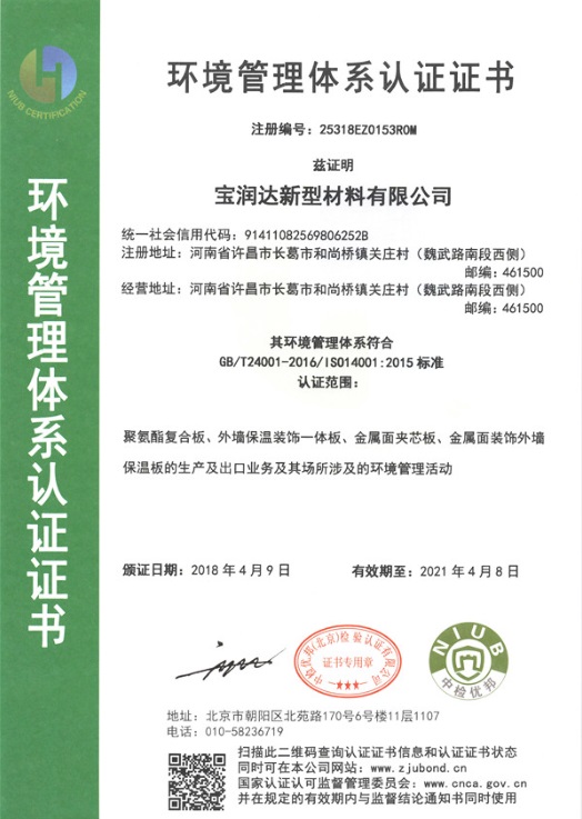 寶潤達環境管理體系認證證書